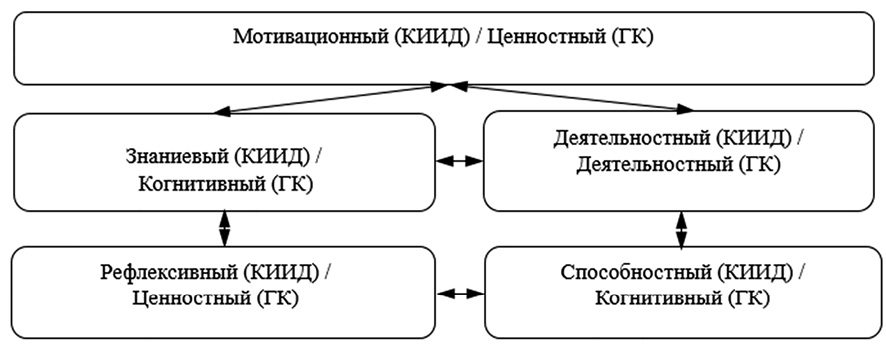 Для достижения цели данного исследования продемонстрируем идентичность структуры КИИД и компонентов в составе ГК. Опираясь на данные табл. 1 и исследований, приведенных выше [9, 12], определим взаимосвязь компонентов ГК с компонентами КИИД (рис. 1).