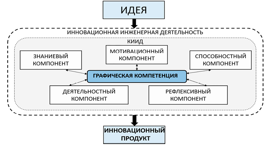 Проведенный в рамках исследования теоретический анализ позволяет полагать, что графические компетенции занимают одно из ключевых мест в структуре инновационной инженерной деятельности, выступая инструментальным средством выражения технической идеи и одновременно являясь компонентом КИИД. Опираясь на структуризацию ИИД и ГК, отраженные в работах авторов, справедливо рассматривать данные понятия как взаимосвязанные компоненты, обеспечивающие будущему инженеру-машиностроителю формирование компетентности к профессиональной деятельности и дальнейшему участию во всех стадиях инновационного цикла.