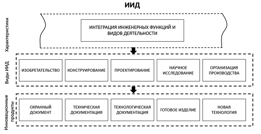 Вопросами определения и структурирования ИИД как части технической деятельности, в различные периоды занимались разные авторы [5–7]. Исследователи МГУ им. Н. П. Огарёва под данным видом деятельности понимают разработку и создание новой техники и технологии, делая акцент на конечном продукте, обладающем правом интеллектуальной собственности.