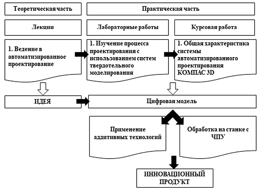Обеспечение последовательности изложения материала на лекционных занятиях, применение полученных знаний на практике в процессе выполнения лабораторных работ и курсовой работы позволяют приобрести целостное представление о возможностях и особенностях применения CAD-систем в машиностроении, овладеть ключевыми ГК в работе с современными системами проектирования и развить способность критической оценки тенденций развития технологий в данной отрасли для дальнейшей ИИД [14].