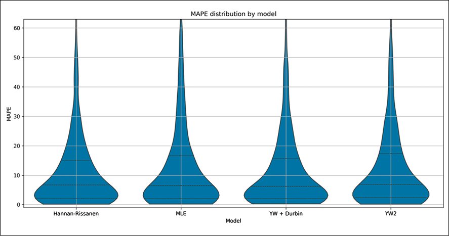 В литературе представлено множество подходов к оценке параметров ARIMA, начиная от классического метода максимального правдоподобия (MLE) и заканчивая различными процедурами, такими как метод Ханнана – Риссанена (HR) [6] или методы, основанные на уравнениях Юла – Уокера (YW) [7]. Каждый из этих методов обладает своими особенностями, теоретическими свойствами, преимуществами и недостатками. Выбор конкретного алгоритма оценки может существенно повлиять не только на статистическую эффективность получаемых оценок и, соответственно, точность прогноза, но и на вычислительную сложность, а также на время, затрачиваемое на обучение модели.