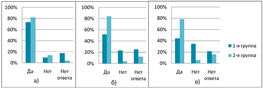 В анкетировании участвовали 52 курсанта, представивших информационно-реферативные работы (первая группа курсантов), и 50 курсантов, выполнивших вычислительные эксперименты, обработку статистической информации или разработавших рационализаторские предложения (вторая группа курсантов). На рис. 2 представлено распределение ответов на вопросы анкеты: а) «Было ли Вам интересно заниматься научной работой?»; б) «Будет ли Вам полезен опыт, приобретенный в процессе научной работы?»; в) «Намерены ли Вы заниматься научной работой на втором курсе?».