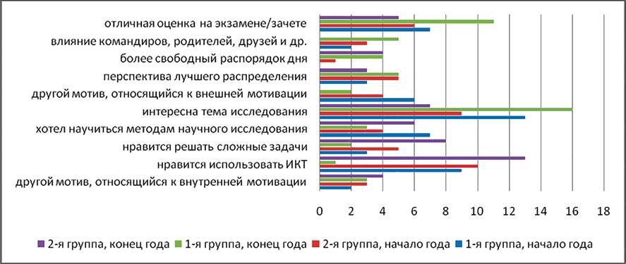 Распределение ответов на вопрос анкеты о ведущем мотиве научной деятельности представлено на рис. 3. По результатам анкетирования в начале учебного года 34 курсанта (65 %) первой группы и 31 курсант (62 %) второй группы выбрали мотив, относящийся к внутренней мотивации, в качестве ведущего мотива их научной деятельности, и значимое различие между группами не было выявлено (χ2 = 0,13, p > 0,05). В конце первого года обучения 25 курсантов (48 %) первой группы и 38 курсантов (76 %) второй группы выбрали в качестве ведущего мотив, относящийся к внутренней мотивации, и было выявлено статистически значимое различие между группами по этому показателю (χ2 = 7,27, p < 0,01).