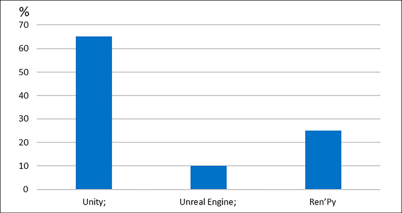 Выбор обучающихся, по мнению авторов, обусловлен популярностью и относительной простотой в использовании сред разработки Unity и Ren’Py. Так, большинство опрашиваемых отдало предпочтение Unity, поскольку школьники считают, что, используя данную среду разработки, можно получить профессиональные навыки по разработке компьютерных игр.