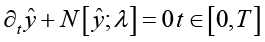 где ŷ(t,x) представляет собой скрытое (неявное) решение или состояние динамической системы, а N[∙] обозначает нелинейный дифференциальный оператор, параметризованный λ. Определим l(t, x) как выражение в левой части уравнения, то есть:
