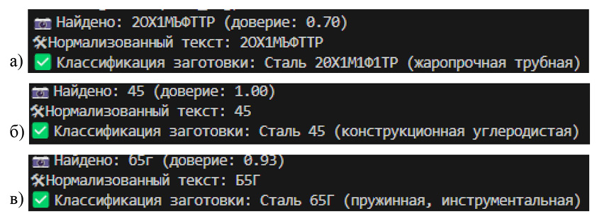 Нормализованные данные сопоставляются с эталонными значениями из базы данных марок стали. Для минимизации ошибок, обусловленных артефактами обработки изображений (зернистость, деградация символов), интегрирован алгоритм нечеткого сравнения на основе алгоритма Левенштейна (библиотека difflib, Python). Данный подход обеспечивает идентификацию соответствий в условиях орфографических вариаций и незначительных расхождений. Ключевой элемент СТЗ – модуль классификации, осуществляющий сопоставление распознанных маркировок стали с эталонными значениями из базы данных. Формирование базы данных основано на анализе наиболее распространенных марок, применяемых на производстве, что обеспечивает оптимальный баланс между компактностью и репрезентативностью охвата материалов [13-15].