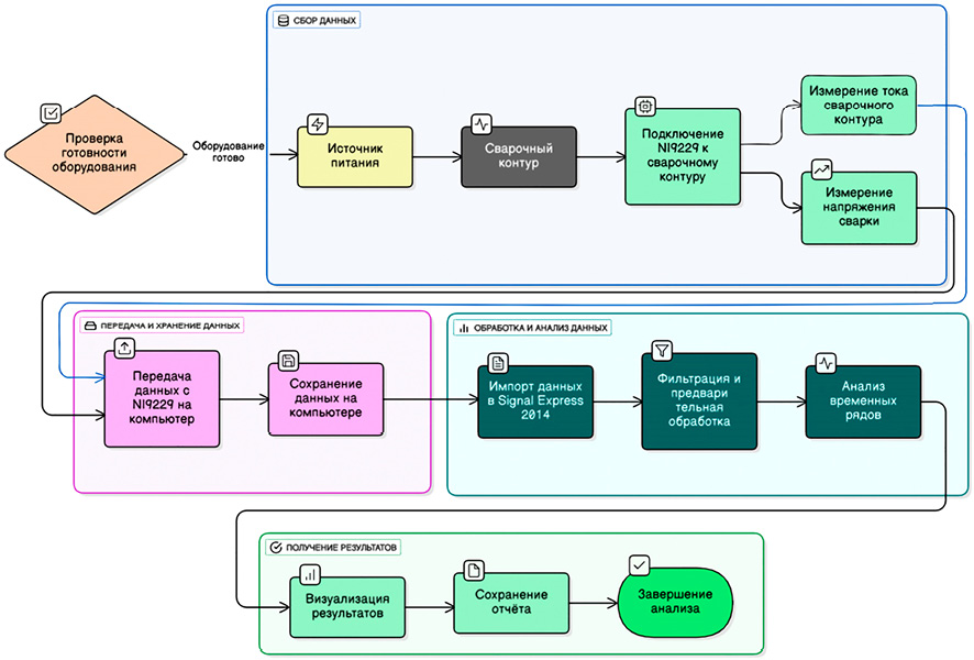 С целью исследования технологических характеристик АСФ выполнялись опытные наплавки на пластину толщиной 16 мм из стали 09Г2С в следующем конвенциальном режиме: ток постоянный обратной полярности, скорость подачи сварочной проволоки Vпп = 110 см/мин., что соответствовало заданию (уставке) тока дуги Iд = 460 А, уставка на режим нагрузки по напряжению сварки (на выходе ИП) Uc = 36 В. Сварочные материалы: электродная проволока Св – 09ХГНМТА-ВИ диаметром Øэ = 4 мм, керамический флюс ФЦК – 16. Сварка АСФ проводилась на постоянной скорости подачи сварочной проволоки, что предполагает [8] использование системы АРДС – автоматического регулирования дуги саморегулированием. Запись временных рядов мгновенных значений АСФ на опытной пробе выполняли на том же автономном регистраторе на базе аналого-цифрового преобразователя (АЦП) NI 9229, что и при определении статической ВАХ. У дельта-сигма АЦП с разрядностью 24 бит есть четыре канала ввода данных на один общий таймер и параллельный режим их дискретизации, что обеспечивает вполне приемлемую точность и производительность – от 1,6 до 50 тысяч выборок (отсчетов) в секунду. Блок-схема процесса измерения и анализа данных представлена на рис. 1.