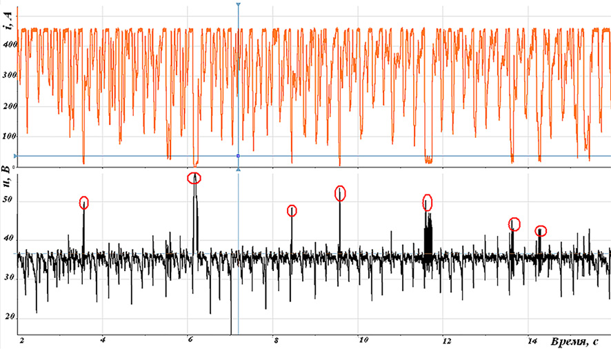 Рис. 3. Временные ряды мгновенных значений тока (i) и напряжения (u); конвенциальная АСФ, уставки по максимальному току дуги I = 460А, напряжение сварки U = 36В; О – кратковременные разрывы сварочной дуги Источник: составлено авторами