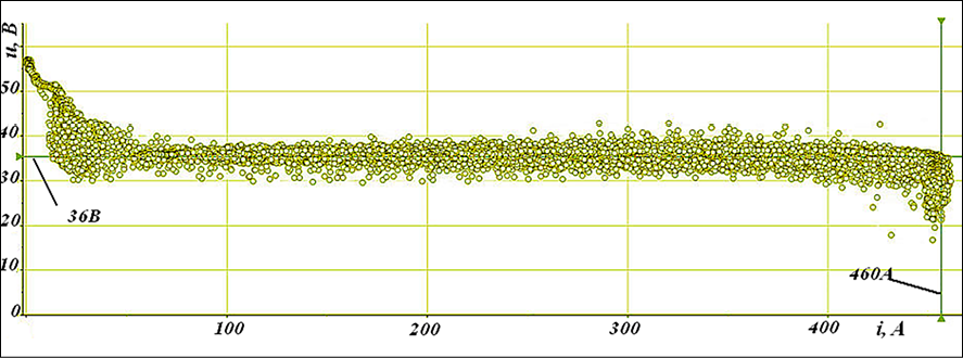 Отбраковка выбросов выполняется по диаграмме рассеяния. Критерием отбраковки выбросов является их значительное отклонение от статической выходной ВАХ ИП, которую можно считать в данном случае общим паттерном диаграммы (рис. 5). Выбросы по напряжению 38,2…57,15 В отбраковке не подлежат, поскольку расположены в пределах управляемого сварочного ЦСП и связаны с отработкой системой управления ИП малых и средних возмущений, кратковременных разрывов сварочной дуги (рис. 3). Точки рассеяния по напряжению образуют устойчивый кластер на ВАХ ИП в интервале отклонений по току до уровня 50…15 А (рис. 4, 5), т.е. являются неотъемлемой частью ЦСП. Отбраковке подлежит выброс (рис. 3) по напряжению ниже 20 В – предела физического существования сварочной дуги под флюсом. Выброс кратковременный (точечный) не оказывает влияния на общую статистику, необходимости в его «нейтрализации» нет.