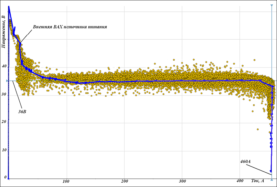 Для понимания диаграммы рассеяния совместим и синхронизируем данные рис. 2, 4. Из рис. 5 очевидно, что корреляционное поле рассеяний реализации процесса АСФ в виде временных рядов тока и напряжения сгруппировано на внешней ВАХ ИП.