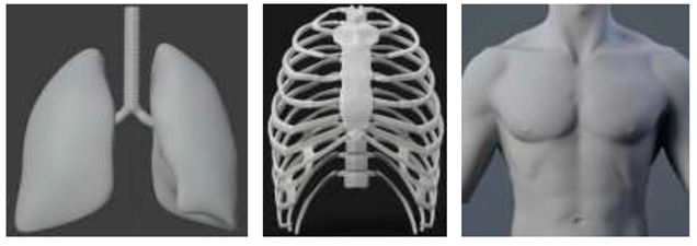 1) в программе Blender 3D разработать геометрию органов средостения человека, включающую в себя легкие, сердце, ребра, позвоночник, мышечную ткань и кожу, позволяющую обеспечить высокое совпадение пропорций и форм органов с реальными, для дальнейшего моделирования нарушений системы внешнего дыхания;