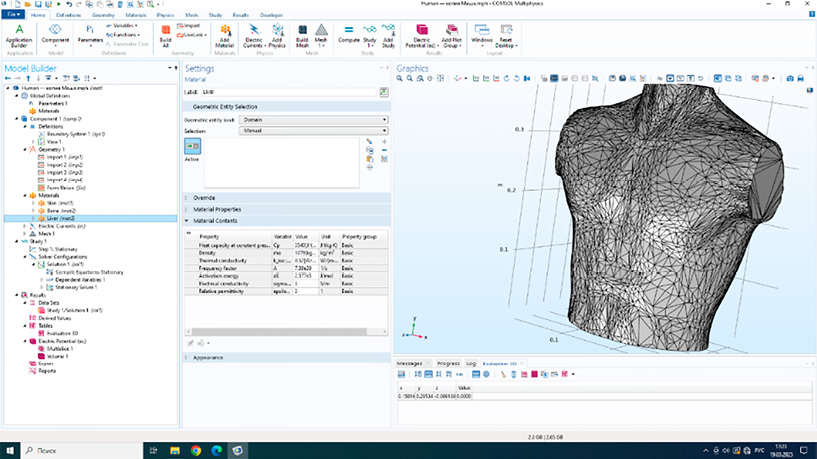 Создание геометрии 3D-модели средостения человека выполнялось в программе Blender 3D. Модель разработана на основе анатомических данных [12] и обеспечивает максимальное соответствие реальным пропорциям и форме органов. Средостение представлено как единая геометрическая структура, внутри которой выделены отдельные области для легких, сердца, ребер и части позвоночного столба, мышечной ткани и кожи. Импорт модели в COMSOL Multiphysics осуществлялся с использованием встроенных инструментов для работы с внешними геометрическими данными.
