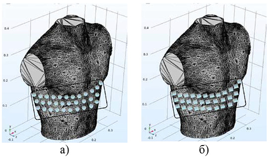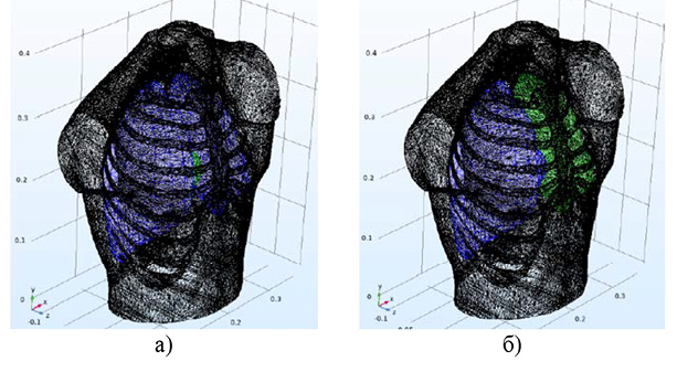 Рис. 4. Трехмерная конечно-элементная модель средостения человека с вариантами размещения электродов: а – использование круглых электродов; б – использование электродов прямоугольной формы (данный функционал реализован, но не исследуется в статье) Примечание: составлено авторами по результатам данного исследования