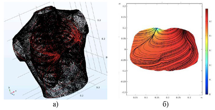 Рис. 5. Трехмерная конечно-элементная модель средостения человека в условиях отсутствия патологий: а – потенциальные линии плотности тока; б – результат оценки распределения электрического потенциала φ и линий плотности тока в сечении на уровне 20 см Примечание: составлено авторами по результатам данного исследования