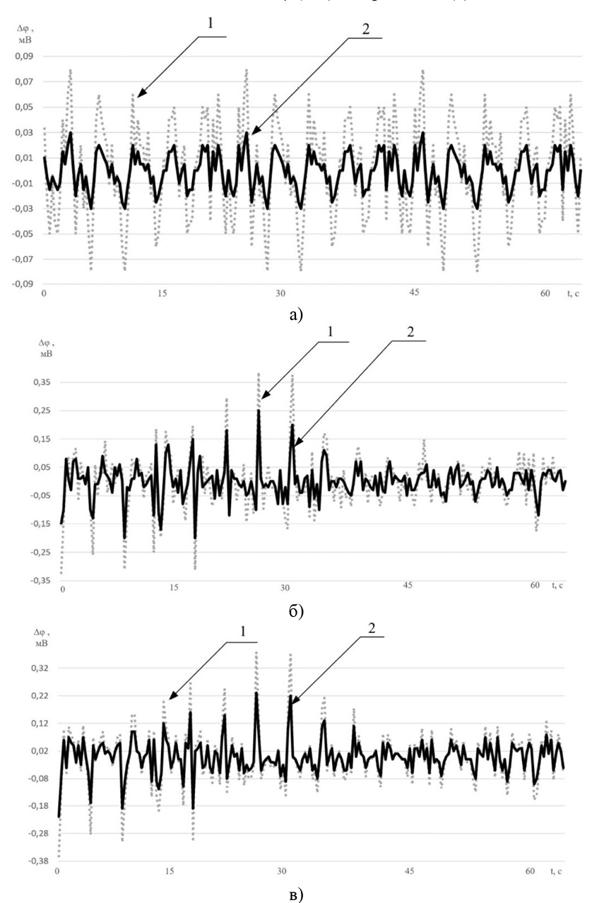 На рисунке 7 приведены результаты исследовательских испытаний для круглых электродов, приведенные на графиках для модели без и с наличием патологий для полного вдоха (с максимальной проводимостью ∆φ) – показан цифрой 1, и полного выдоха (с минимальной проводимостью ∆φ) – показан цифрой 2. На графиках представлена зависимость значения изменения потенциалов ∆φ (мВ) от времени t (с).