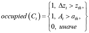 После получения координат посадочной ячейки запускается подсистема проверки заполненности ячейки. Для каждой ячейки Ci используется локальный прямоугольный ROI, параметризированный центром, размерами и ориентацией. Ячейка помечается «занятой», если медианная глубина точек внутри ROI превышает адаптивный порог zth, либо площадь пикселей переднего плана в ROI превосходит порог ath.
