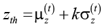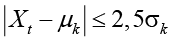 где σk – стандартное отклонение от k-й гауссовой компоненты, характеризующее разброс значений около ее среднего μk. Пороговое значение на основе дисперсии в 2,5σk было подобрано эмпирически и примерно соответствует покрытию 98–99 % данных нормального распределения, что обеспечивает баланс между чувствительностью и устойчивостью к шуму.