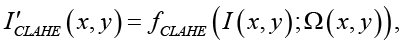 Ω(x, y) – локальная область вокруг пикселя (x, y), используемая для построения гистограммы и адаптивной коррекции яркости.