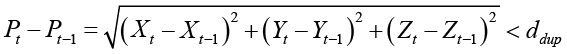 После детекции объектов возникает необходимость исключить повторную передачу координат объектов роботу-манипулятору, так как это может привести к нежелательным повторным действиям. Для предотвращения такой ситуации используется механизм подавления повторных детекций обнаруженных целей. На каждом шаге координаты вновь найденных объектов сопоставляются с массивом объектов, которые были опубликованы на предыдущих кадрах. Сравнение производится путем вычисления евклидова расстояния между текущими Pt и ранее переданными координатами предыдущего объекта Pt-1 по следующей формуле: