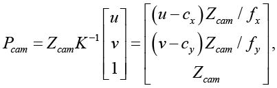Сначала происходит преобразование пикселя к камерным 3D-координатам с учетом внутренних параметров камеры и предварительной компенсации дисторсии. Координаты точки в камерной системе вычисляются по однородной модели проекции: