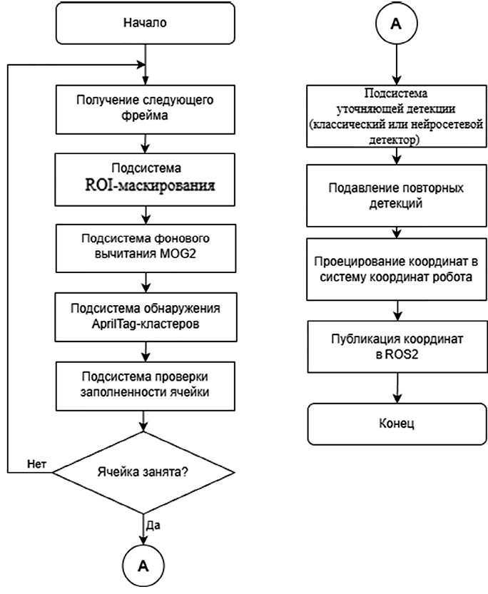 Рис. 3. Иллюстрация работы подсистемы обнаружения AprilTag-кластеров и проверки заполненности посадочных ячеек Примечание: составлен авторами по результатам данного исследования