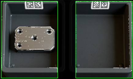 Если хотя бы одна ячейка признана «занятой», в ее ROI запускается контурный детектор для уточнения контура детали. Вместо поиска произвольных контуров по всему кадру алгоритм работает с небольшим четко закрепленным набором «посадочных» точек, что существенно уменьшает ложные срабатывания и упрощает ввод новых типов деталей.
