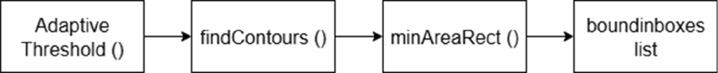 В предлагаемой методике рассматривается два варианта детектора – нейросетевой и контурный. В контурном режиме детекция происходит с использованием алгоритмов бинаризации и поиска контуров, формирующих ограничивающие рамки объектов. Контурный детектор работает в несколько последовательных этапов, обеспечивая эффективность и низкую вычислительную нагрузку при обработке изображений с простыми геометрическими формами. Первоначально изображение подвергается адаптивной пороговой обработке, благодаря чему достигается устойчивость к изменениям освещения и текстуры объекта. Затем на полученной бинарной маске выполняется поиск контуров методом поиска замкнутых границ, после чего осуществляется аппроксимация формы минимальным вписанным прямоугольником, который задает окончательные границы обнаруженного объекта. На рис. 4 представлена схема работы контурного детектора.