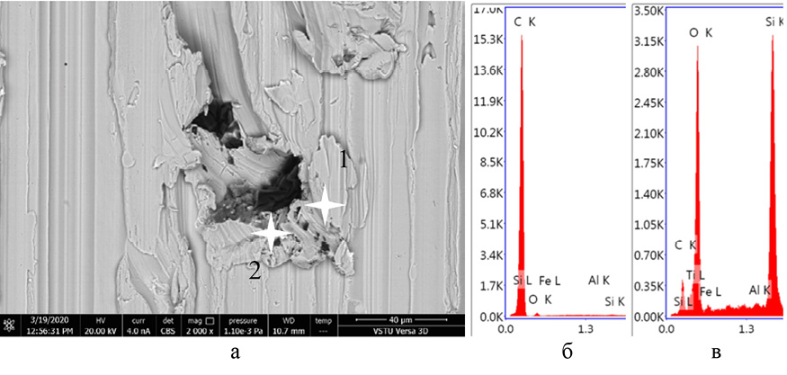 Рис. 1. Изображение внедренных в поверхность железа продуктов износа (а) и результаты их рентгеноспектрального анализа в точке 1 (б) и точке 2 (в) Источник: составлено авторами по результатам данного исследования
