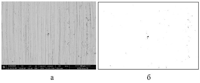 Рис. 2. Изображение поверхности никеля после шлифования (а) и результаты бинаризации изображения (б) Источник: составлено авторами по результатам данного исследования