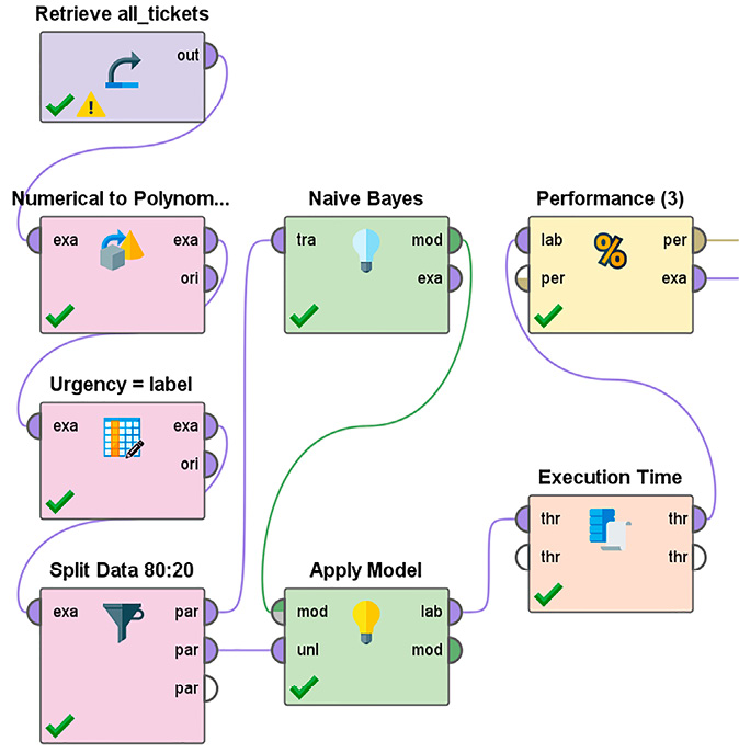 Отметим основные этапы моделирования алгоритма наивного байесовского классификатора: на предварительном этапе (общий для всех алгоритмов) подготавливаются данные для проведения эксперимента – на рисунке эти операции выполняют блоки Retriever all_tickets, Numerical to Polinom, Ugrency, Split Data, далее рассчитываются априорные вероятности принадлежности заявки к определенному классу, этот расчет во многом основывается на предварительных данных, как субъективных, так и объективных, и формируется функция правдоподобия как результат проведения статистического моделирования (блок Native Bayes). Для задачи классификации достаточно найти класс с максимальной апостериорной вероятностью. На заключительном этапе проводятся измерения выбранных ранее показателей модели (блоки Performance и Execution Time).