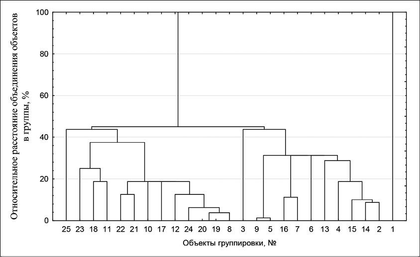 Дендрограмма объединения индивидуальных соединений (относительное евклидово расстояние) Примечание: составлена автором по результатам данного исследования