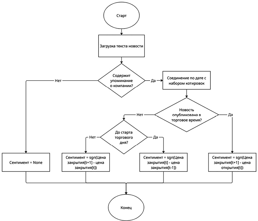 Риc. 1. Алгоритм разметки сентимента с помощью дневных данных с учётом времени закрытия и открытия торгового дня Источник: составлено авторами