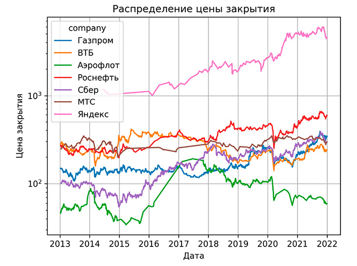 Распределение цены обыкновенных акций компаний Газпром, Роснефть, МТС, Аэрофлот, Яндекс, Сбербанк и ВТБ за выбранный временной период представлено на рисунке 2.