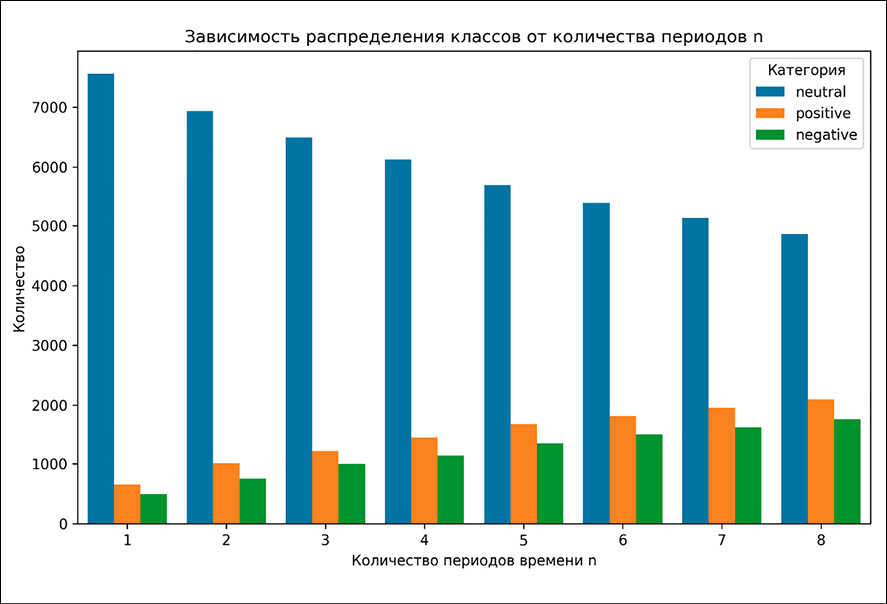 С увеличением числа периодов в высокочастотном методе разметки растёт и количество классов с позитивной или негативной разметкой с динамикой цены выше заданного порога (рис. 4).