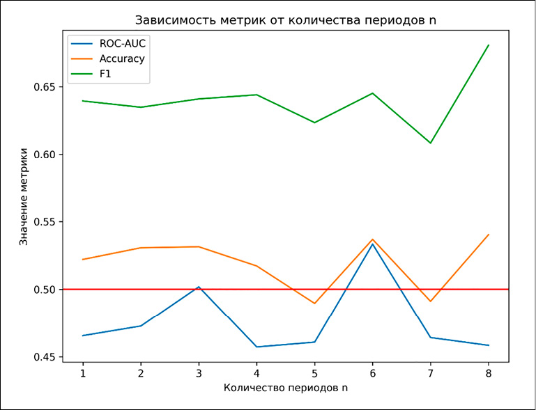 Рис. 4. График метрик качества модели в зависимости от количества периодов n Источник: составлено авторами