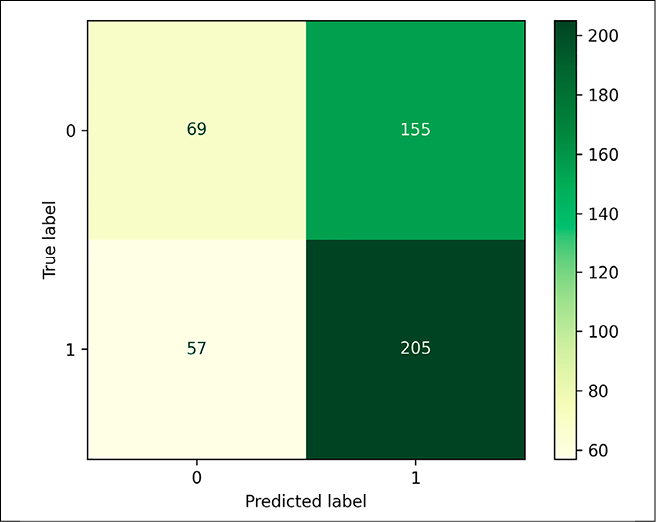 Порог отсечения подбирался через максимизацию F1-оценки, максимальное значение метрики было достигнуто при пороге 0.49. Показатели accuracy, precision, recall и f1 после изменения порога увеличились до 0.57, 0.57, 0.82, 0.67, что является небольшим улучшением по сравнению со стандартным порогом 0.5.