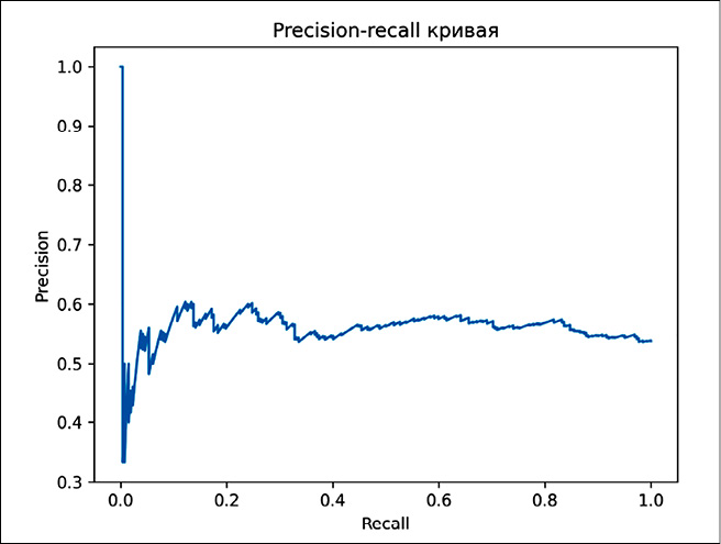 Дополнительно был произведен подбор порога отсечения для лучшей модели с целью найти такой порог, для которого значения precision и recall будут, для этого была построена PR-кривая, представленная на рисунке 6.