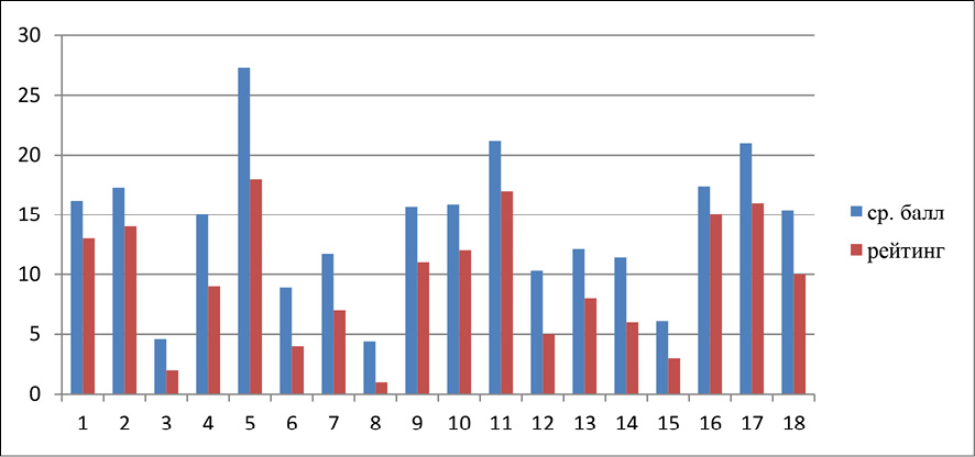 Рис. 2. Рейтинг инструментальных ценностей подростков: 1 – аккуратность; 2 – воспитанность; 3 – высокие запросы; 4 – жизнерадостность; 5 – исполнительность; 6 – независимость; 7 – нетерпимость к недостаткам; 8 – образованность; 9 – ответственность; 10 – рационализм; 11 – самоконтроль; 12 – смелость в отстаивании мнения; 13 – твердая воля; 14 – терпимость; 15 – широта взглядов; 16 – честность; 17 – чуткость; 18 – эффективность в делах Примечание: составлен авторами по результатам данного исследования