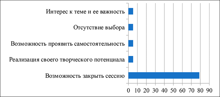 – 21,1 % опрошенных выбрали другие варианты, которые в совокупности распределились примерно по 2,6 % и связаны с отсутствием выбора. Например, были получены такие ответы, как «сказали, что это обязательно», «думала, что закрою сессию целиком».