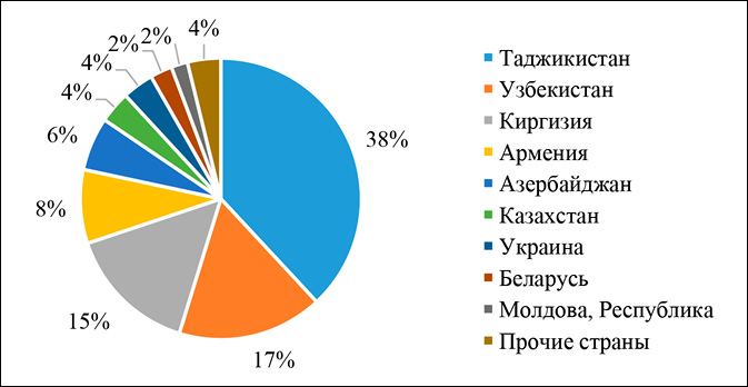 Общие числовые показатели обучающихся иностранцев соответствуют уровню 33–39 тыс. чел в системе дошкольного воспитания и 171–176 тыс. чел в системе общего образования. В период с 2022 по 2024 г. динамика численности обучающихся с иностранным гражданством показывает устойчивый рост в сегменте дошкольных учреждений и некоторое сокращение количества иностранцев, обучающихся в системе общего образования. Динамика данных показателей связана прежде всего с процессом трудовой миграции и высоким интеграционным потенциалом российской системы образования, обусловленным наличием ряда международных соглашений, гарантирующих бесплатное дошкольное и школьное образование для детей, имеющих иностранное гражданство. Наибольшее количество детей в системе дошкольного и общего образования присутствует в Центральном, Северо-Западном и Уральском федеральных округах, что обусловлено экономической привлекательностью регионов для трудовой миграции взрослых членов семьи мигрантов. В последние годы на динамику численности детей иностранцев оказывает влияние ужесточение миграционной политики Российской Федерации. Одним из ключевых факторов становится необходимость официального подтверждения владения русским языком, что является обязательным условием для получения разрешения на пребывание и права на обучение. Данный нормативный барьер формирует новую структуру миграционных потоков, снижая приток иностранных граждан с недостаточным уровнем языковой подготовки и увеличивая востребованность программ предварительной адаптации и интеграции. Структура по странам происхождения воспитанников, имеющих иностранное гражданство, представлена на рисунке.