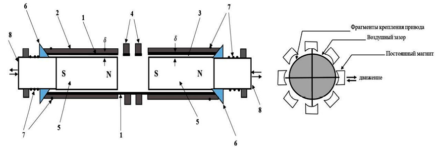 Рис. 4. Линейный электрический генератор с электромагнитным регулятором воздушного зазора: 1 – цилиндрический корпус; 2 – катушки с осевыми обмотками; 3 – воздушный зазор (δ); 4 – центральная катушка с радиальной обмоткой; 5 – магнитные сердечники; 6 – опорный конус; 7 – винтовая пружина; 8 – фрагменты крепления привода Примечание: составлен авторами