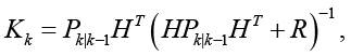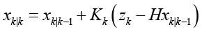 где Kk – усиление Калмана, P – ковариационная матрица оценки, H – матрица наблюдений, R – ковариация измерений и zk – измерение.