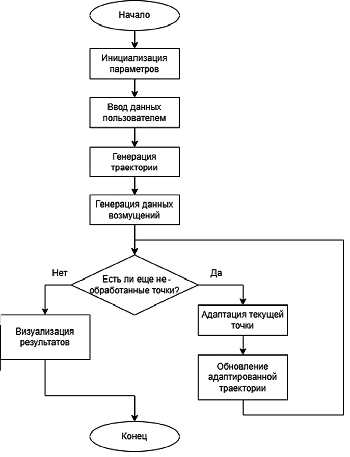 Эта блок-схема отражает последовательность действий программы от запуска до завершения, включая взаимодействие с пользователем, генерацию траектории и визуализацию.