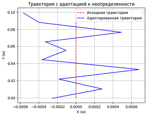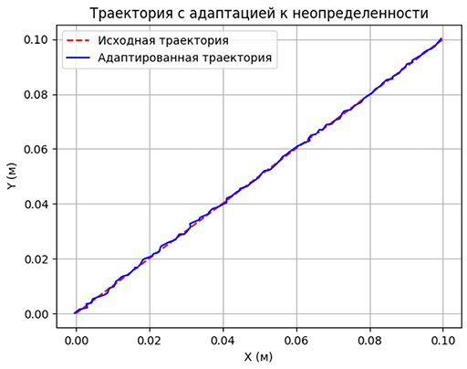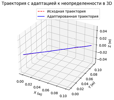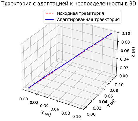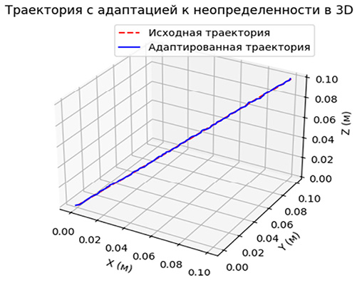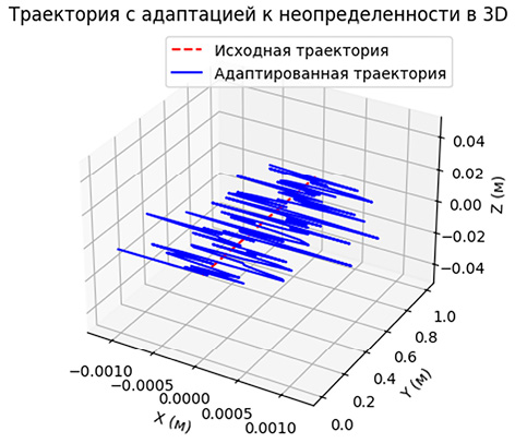 Для демонстрации эффективности построенного управления применяется графическая визуализация исходной и адаптированной траекторий в трехмерной координатной системе. Использование таких средств позволяет наглядно представить степень отклонения и корректировки траектории в условиях действия случайных факторов.