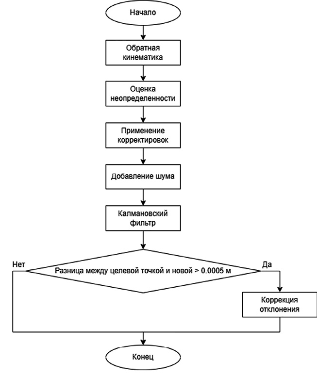 Для повышения точности и устойчивости управления в условиях внешних возмущений и погрешностей измерений применялся комбинированный алгоритм коррекции, основанный на методах нечеткой логики [11] и фильтрации состояний [12]. Нечеткая логика использовалась для формирования корректирующих воздействий на траекторию с учетом неопределенных входных параметров, а рекурсивный фильтр Калмана – для сглаживания координат и компенсации шумов сенсорных данных. Эффективность предложенного подхода оценивалась по результатам моделирования движения манипулятора по траекториям различной геометрии с анализом отклонений фактического положения от заданного.