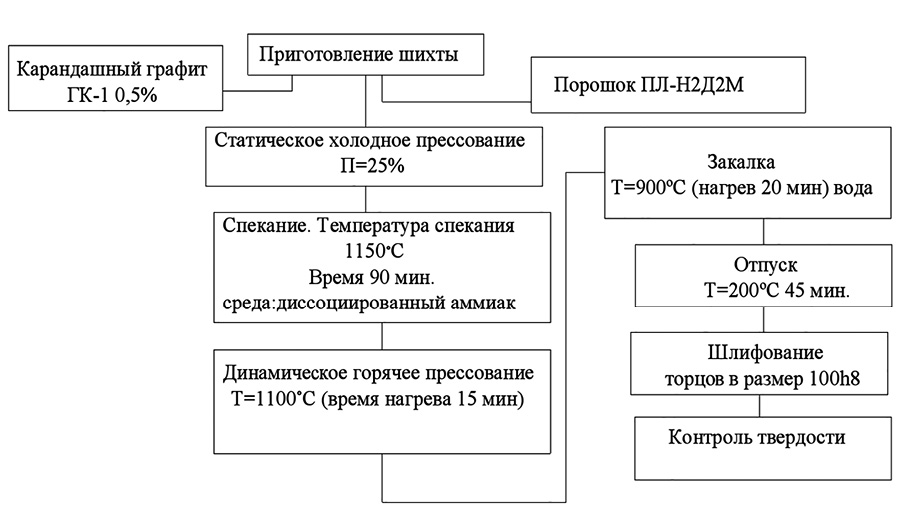 В качестве исходного сырья был взят отечественный порошок марки ПЛ-Н2Д2М (ТУ 14-5402-2002) производства ПАО «Северсталь» (г. Череповец). Порошок ПЛ-Н2Д2М – это диффузионно легированный железный порошок, полученный методом отжига смеси порошков, содержащих легирующие добавки. Химический состав используемого порошка представлен в табл. 1 [5; 6].