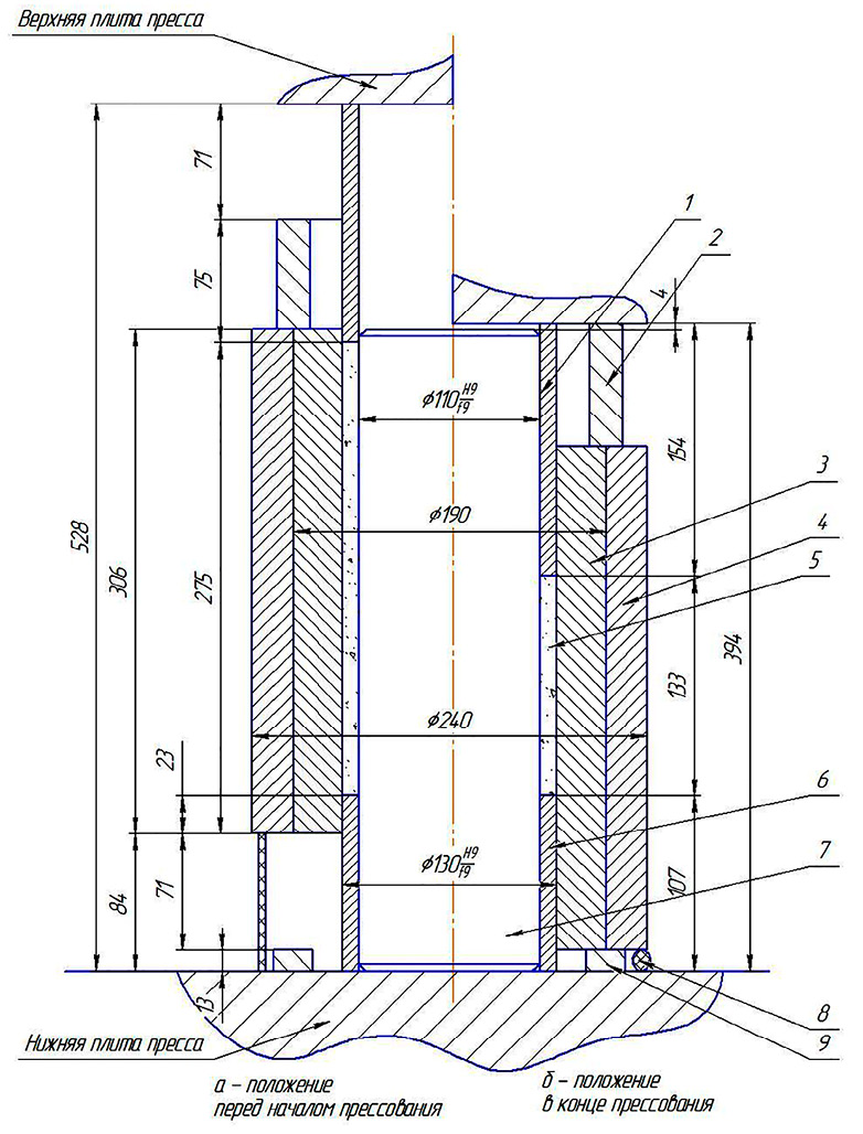Рис. 5. Пресс-форма СХП порошковой заготовки: а) положение перед началом прессования, б) положение в конце прессования Примечание: составлен авторами по результатам исследования