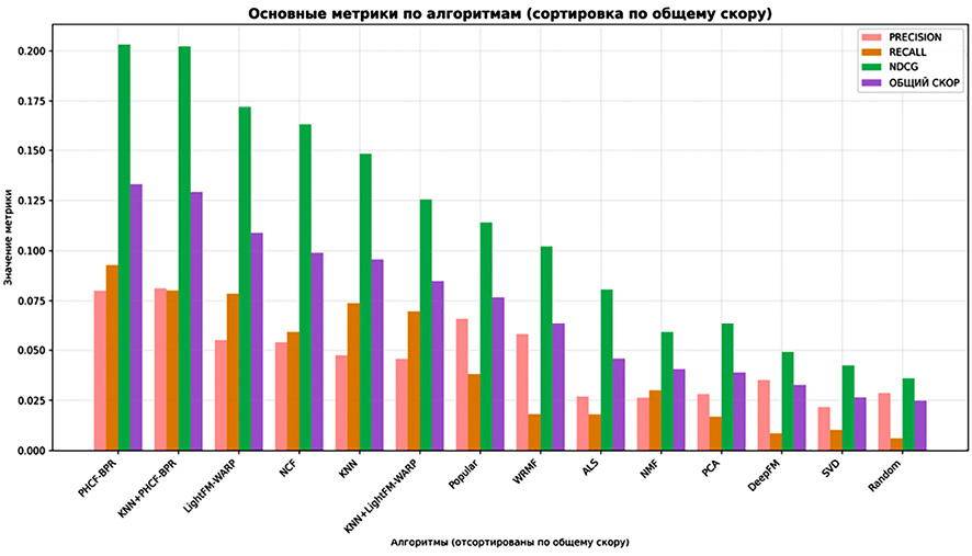 Модель PHCF-BPR обеспечила наивысший суммарный скор (0,1331) за счет сбалансированных значений Precision (0,0801), Recall (0,0929) и особенно высокого NDCG (0,2031). Гибрид KNN+PHCF-BPR занял второе место (0,1293) с наилучшим значением Precision (0,0813) и почти таким же высоким NDCG (0,2021). Третью позицию занял LightFM-WARP (общий скор 0,1089). Напротив, классические методы и нейросетевые модели показали существенно более низкие результаты: так, NCF набрал суммарный скор 0,0990, уступив LightFM-методам и находясь на уровне простого KNN (0,0957), а DeepFM с общим скором 0,0327 продемонстрировал минимальную эффективность. Базовый метод Popular показал умеренную точность (Precision 0,0661) при очень низкой полноте (Recall 0,0380), что указывает на то, что частые сервисы хорошо работают на Precision, но не покрывают все релевантные объекты. Случайная стратегия (Random) дала худшие результаты по всем метрикам, что подтверждает обоснованность использования более сложных методов.