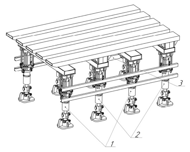 Рис. 1. Самопередвигающаяся крепь: 1 – первая секция; 2 – вторая секция; 3 – передвигающее устройство Примечание: составлен авторами по результатам данного исследования