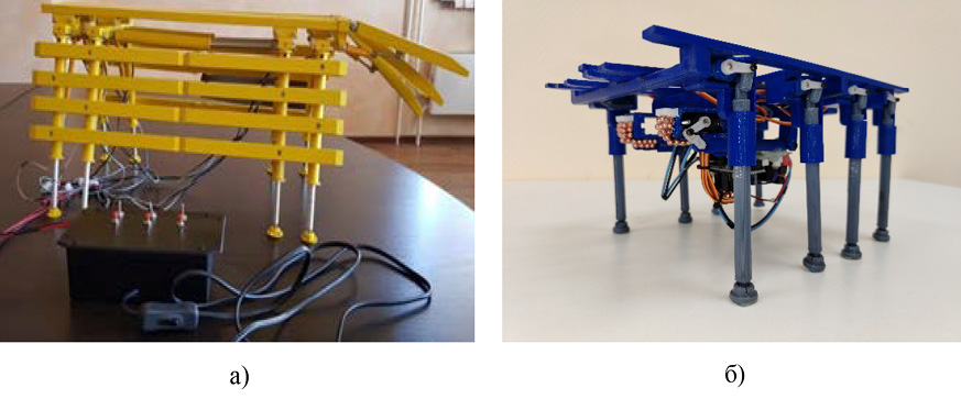 На основе метода физического моделирования в соответствии с ГОСТ Р 70023-2022 были разработаны конструктивные технические решения и обоснованы принципы работы и параметры самопередвигающейся крепи [27]. Для проведения экспериментальных исследований процесса передвижки секций крепи были разработаны и изготовлены соответствующие физические модели: с ручным управлением в масштабе 1:10 (рис. 2, а) и модель, воспроизводящая процесс передвижки секций в автоматическом режиме, в масштабе 1:25 (рис. 2, б).
